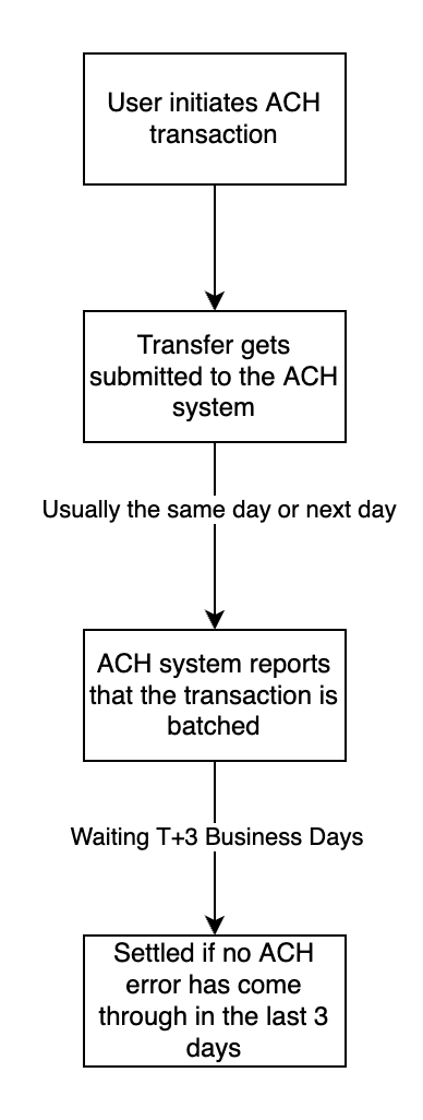 ACH payments settle after T+3 business days from batching.